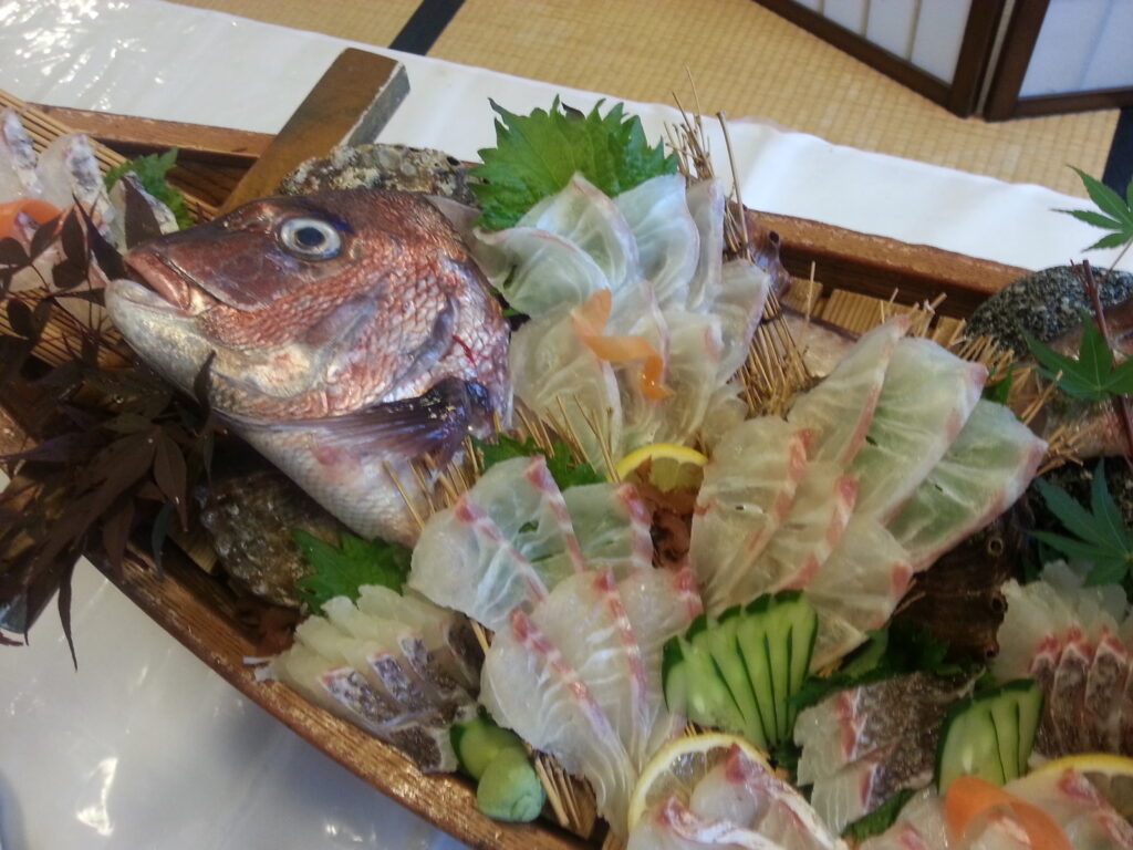 地元で捕れた魚のお刺身にお魚の塩焼き(お煮つけ)や天ぷら、さざえと海老の陶板焼きなどが付いています。